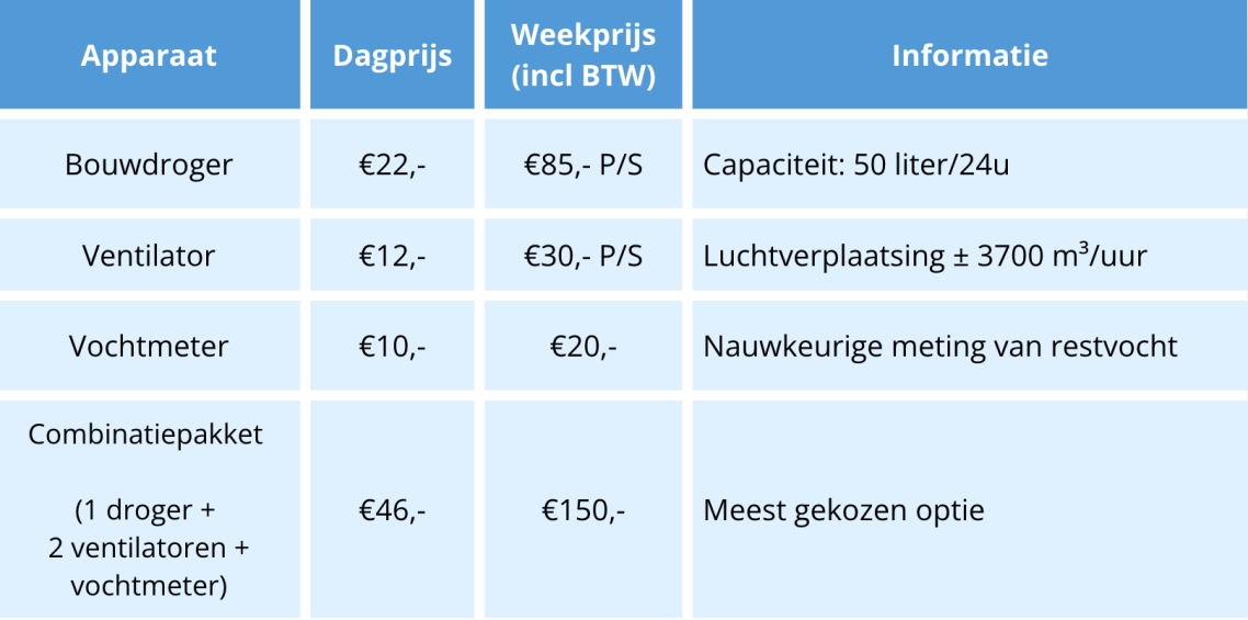 Bij BRIK Droogbouw Verhuur bepaal je zelf hoelang je onze droogapparatuur nodig hebt. Heb je snel een oplossing nodig? Of wil je juist voor een langere periode huren? Wij bieden drie opties:
