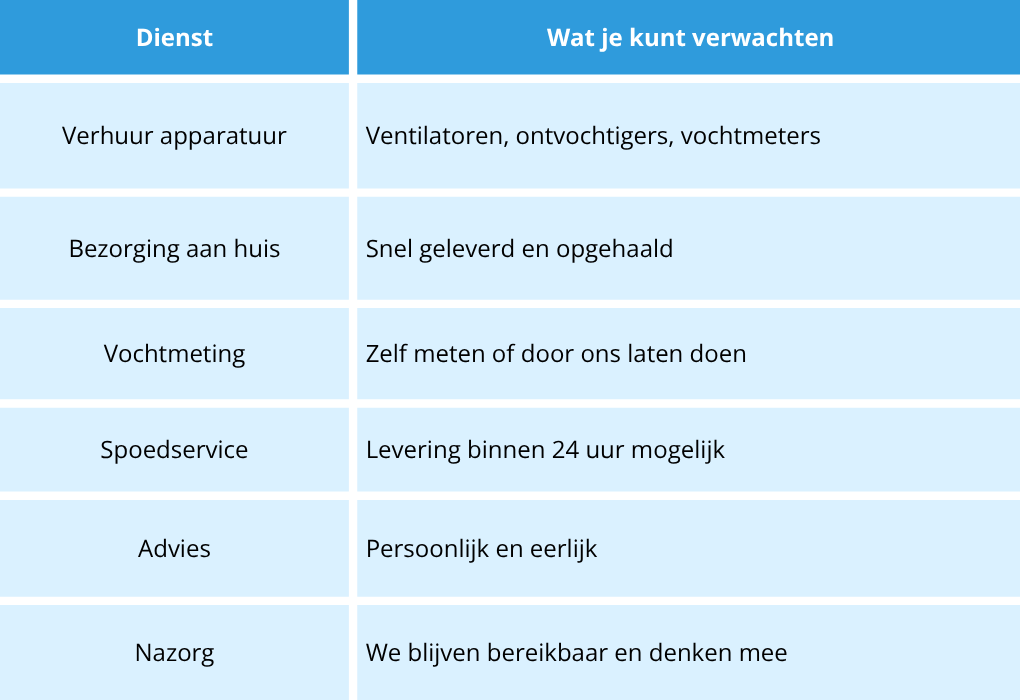 Twijfel je of alles al droog is? Huur een vochtmeter of laat ons een meting doen. Zo weet je zeker dat je niet te kort – of juist te lang – huurt. Dat scheelt tijd en geld.